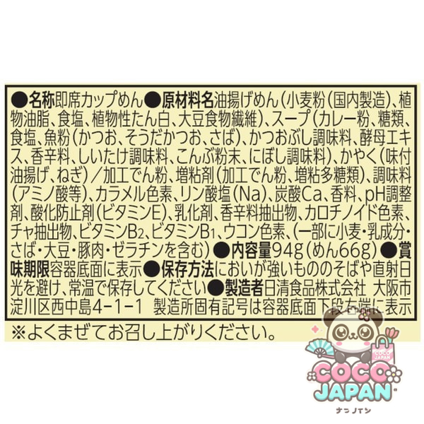 맛 카레면의 양 보통 다른 닛신 식품의 식품&음료・술을 찾는 식품&음료・술 닛신 식품 > 인스턴트 식품 닛신 식품 > 컵라면 닛신 식품 > 컵라면(메밀・우동・파스타 등) 국수 무게 66g) ● 음식 ​​알레르기 : 밀, 우유, 고등어, 콩, 돼지고기, 젤라틴 푸(카레가루, 당류, 식염, 생선가루(가다랑어, 가다랭이, 고등어), 가다랭이 조미료, 효모 엑기스, 향신료, 표고버섯 조미료, 콩부분말, 에보시 조미료), 곱게(맛부유 튀김) , 파)/가공 전분, 증점제(가공 전분, 증점 다당류), 조미료(아미노산 등), 카라멜 색소, 인산염(Na), 탄산 Ca, 향료, pH 조정제, 산화 방지제(비타민 E) , 유화제, 향신료 추출물, 카로티노이드 색소, 챠 추출물, 비타민 B2, 비타민 B1, 심황 색소, (일부에 밀·유 성분·고등·대두·돼지고기·젤라틴을 포함한다) ●영양 성분 표시 (1식(94g)당) 에너지: 396kcal, 단백질: 8.4g, 지질: 13.4g, 탄수화물: 60.5g, 식염 상당량: 5g, 비타민 B1: 0.2mg, 비타민 B2: 0.26mg, 칼슘: ​​218mg